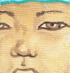 2008Tibetaans portret. Miniatuur schilderij, 4x4cm, acryl op canvasboard. Tibetan Portrait 2. This is a miniature painting, 4x4cm, acrylics on canvasboard..
